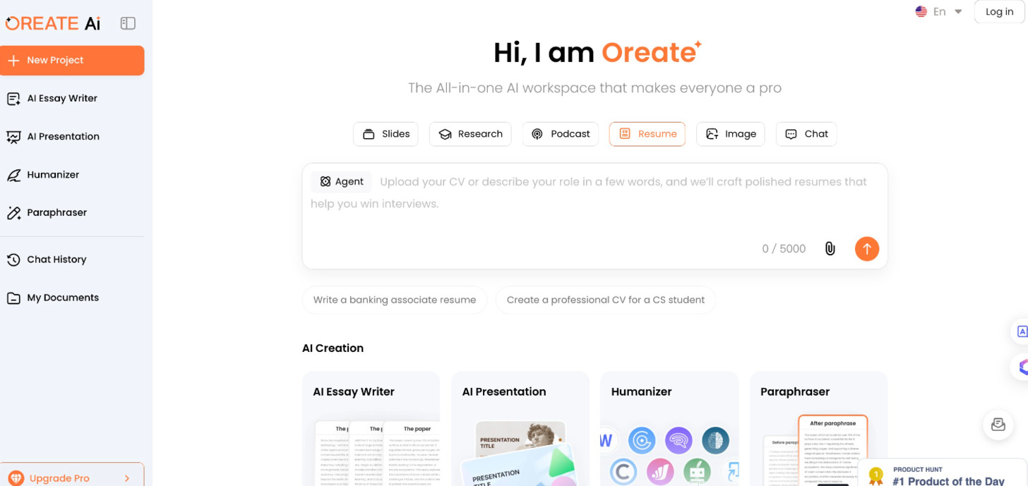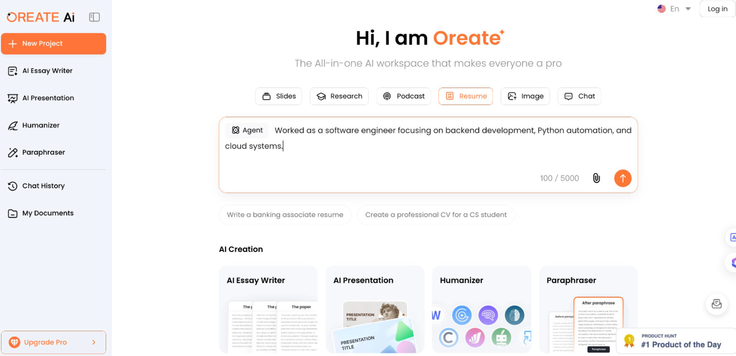 1. Oreate AI — Oreate AI’s Resume feature helps users instantly create professional, ATS-optimized resumes. It focuses on fast first-draft generation, clear structure, and easy personalization — all for free.