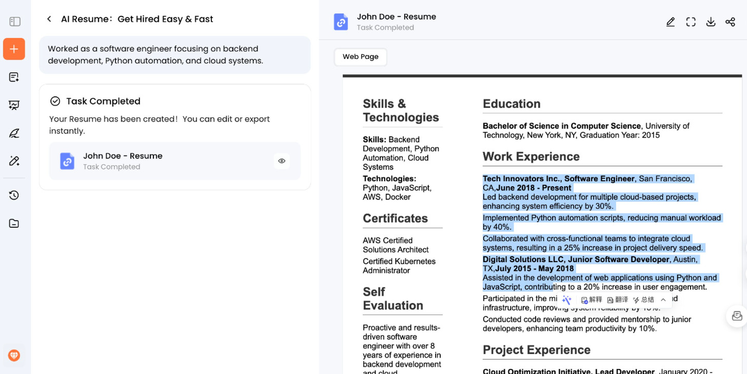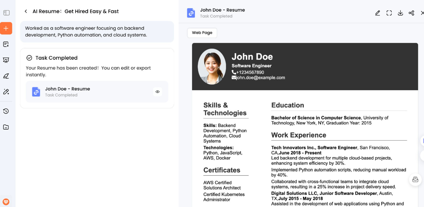 Once you provide your information, Oreate AI instantly produces a polished, structured resume. The draft highlights your core skills, measurable achievements, and professional strengths, giving you a resume that is recruiter-friendly and optimized for Applicant Tracking Systems (ATS). This saves you the hours or even days often spent formatting and rewriting your CV manually.
