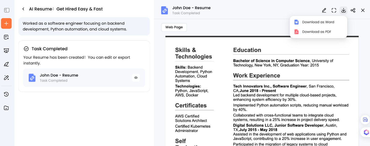 After finalizing edits, download your completed resume in Word or PDF format. Your resume is now ready to submit to potential employers, showcasing your achievements and qualifications in a clear, professional format.